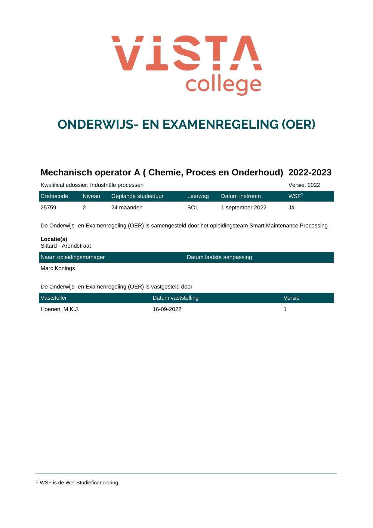 Mechanisch operator A ( Chemie, Proces en Onderhoud) 25759O1S in cohort 2022-2023