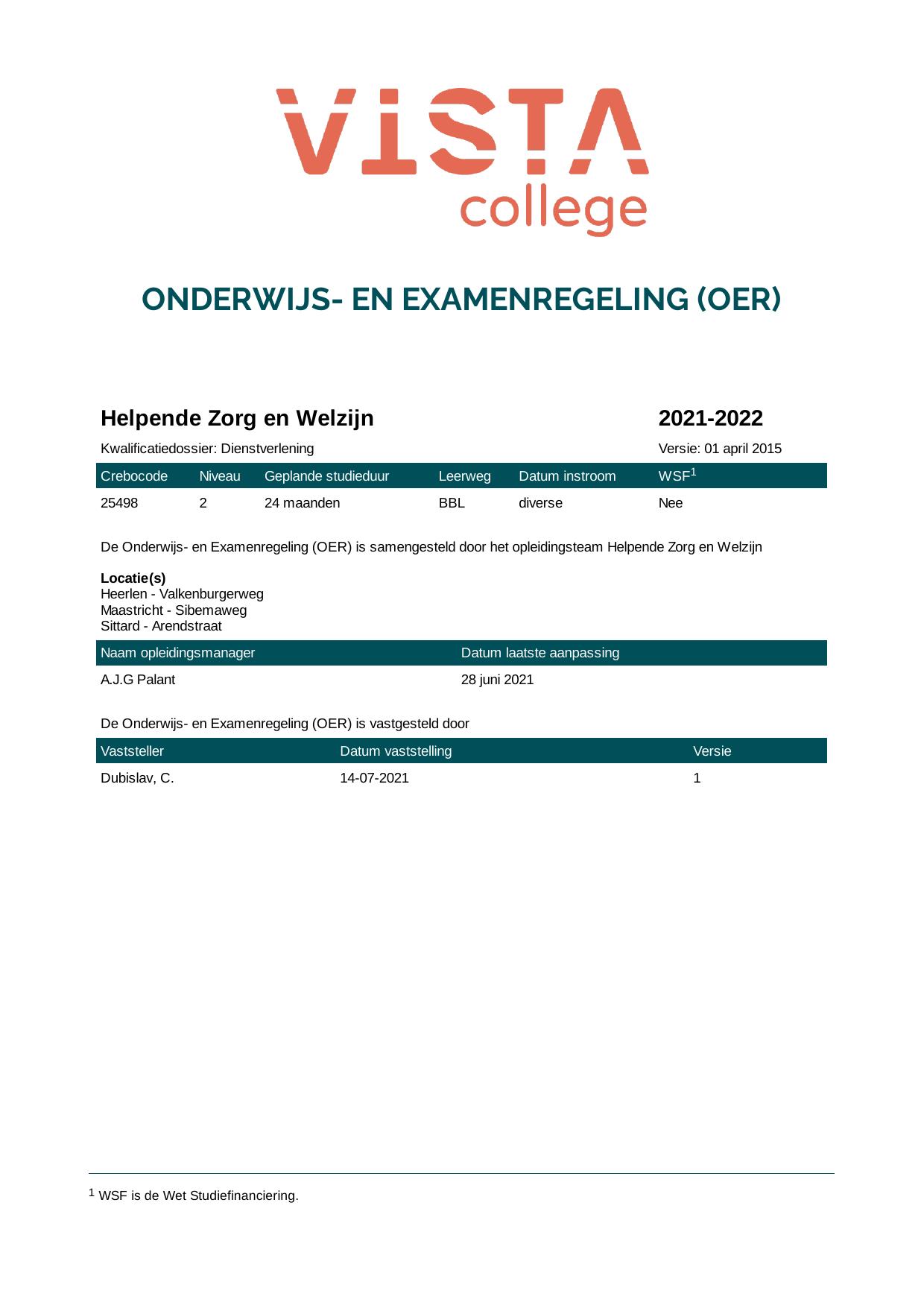 Helpende Zorg en Welzijn 25498BBL in cohort 2021-2022