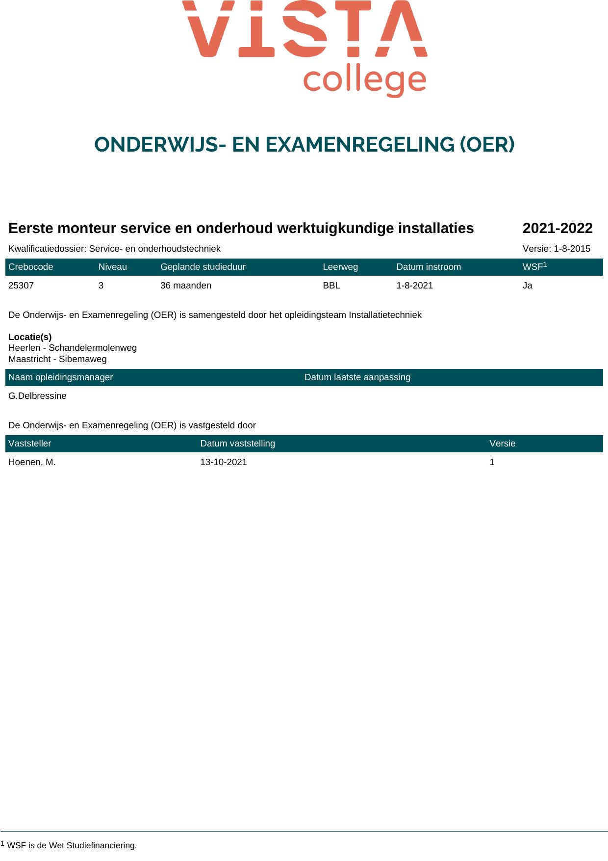 Eerste monteur service en onderhoud werktuigkundige installaties 25307B1S in cohort 2021-2022