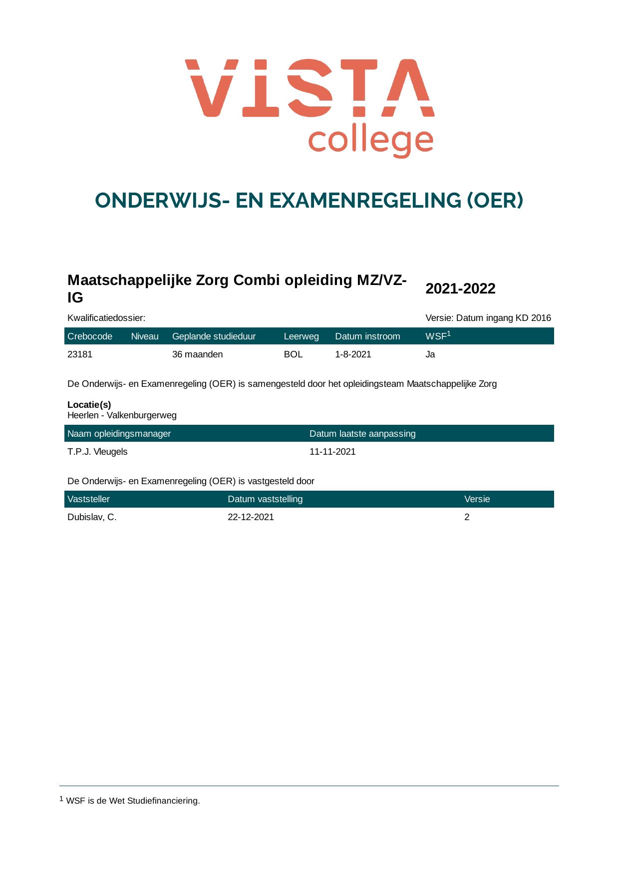 Maatschappelijke Zorg Combi opleiding MZ/VZ-IG 23181O1S in cohort 2021-2022