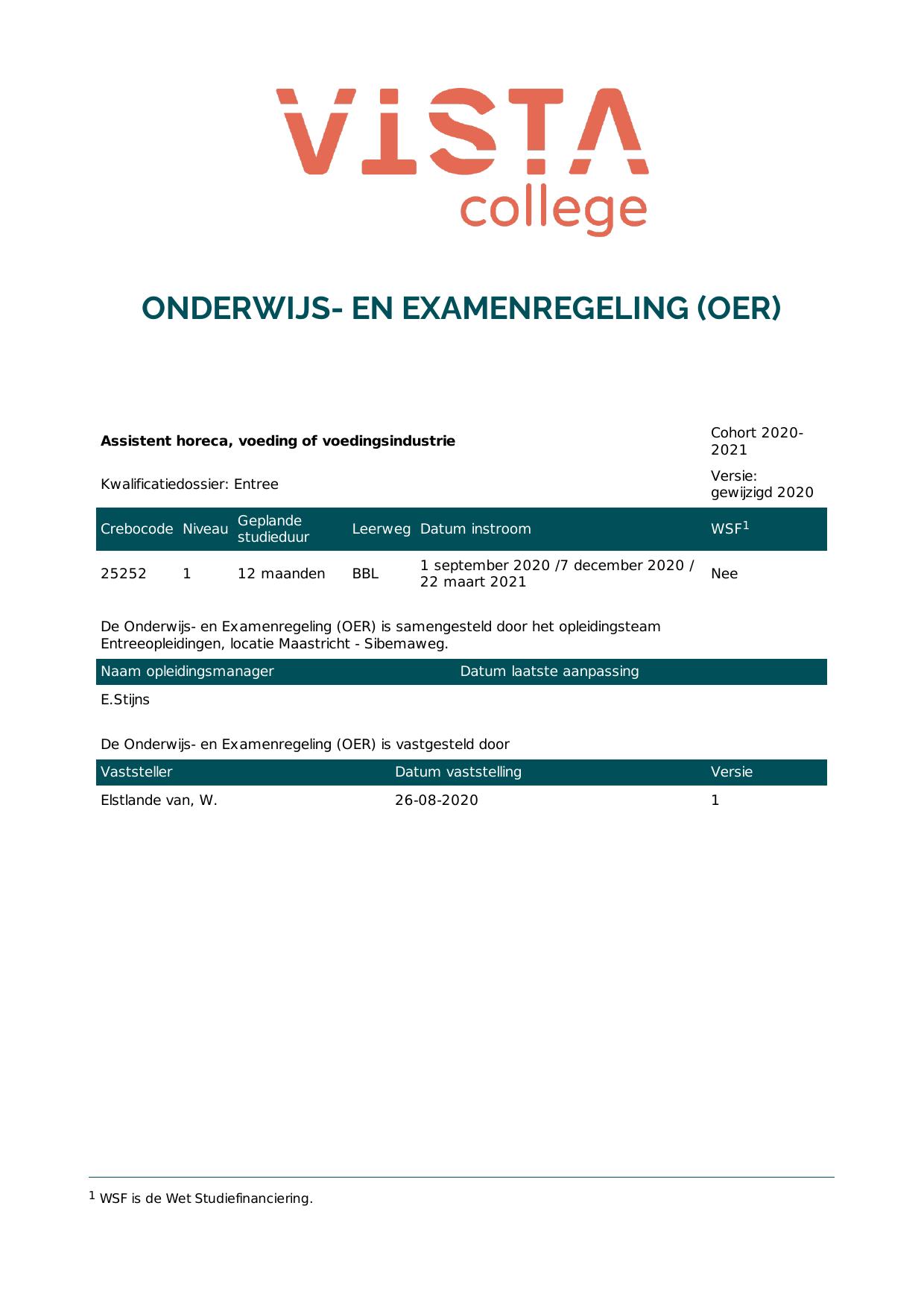 Assistent horeca, voeding of voedingsindustrie 5A25252BB1V1 in cohort 2020-2021