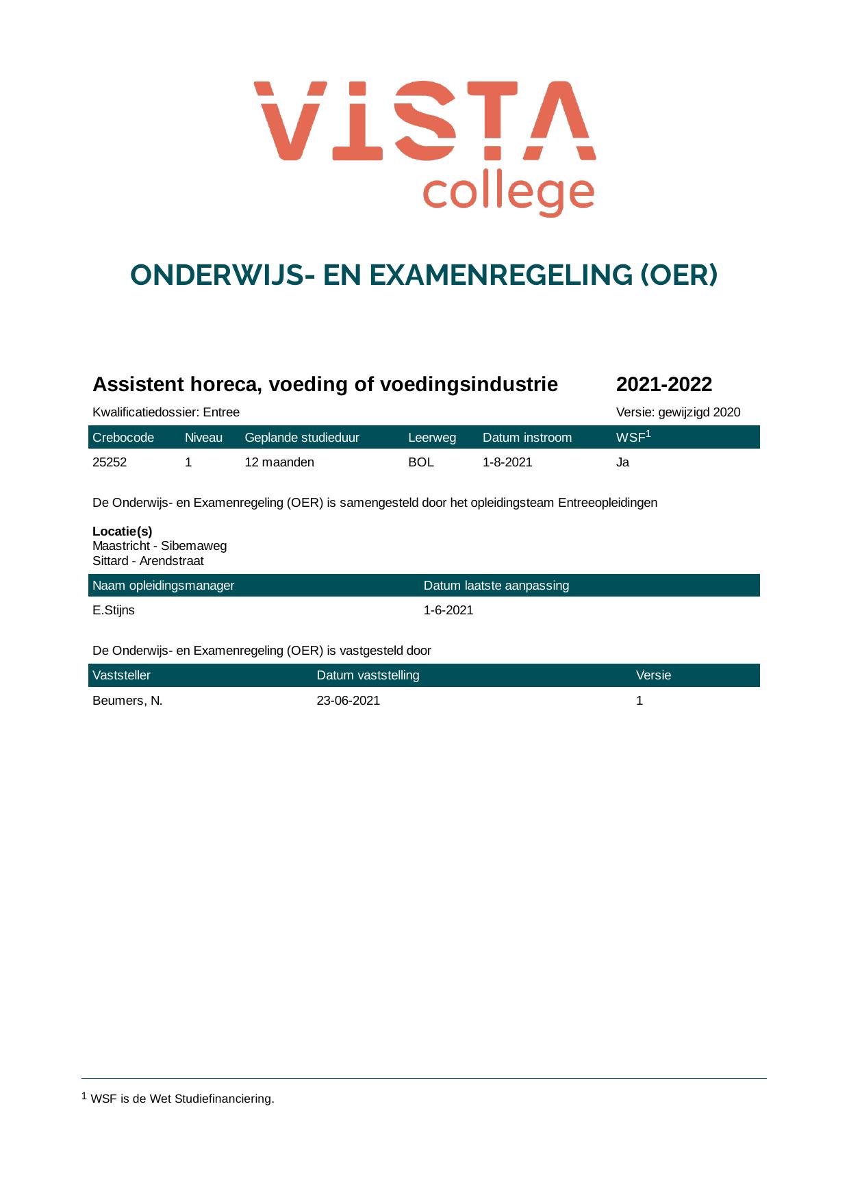 Assistent horeca, voeding of voedingsindustrie 5A25252BV1V1 in cohort 2021-2022